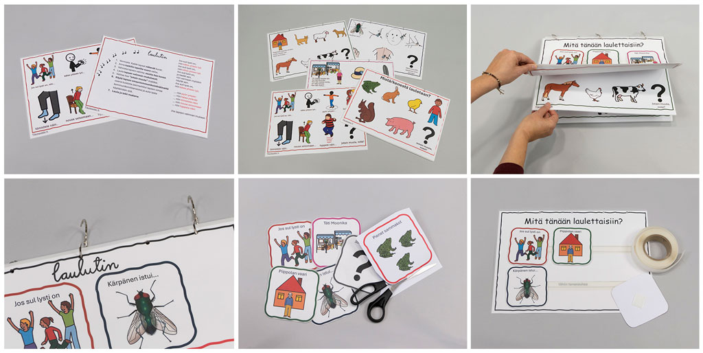Laulutin-toimintamallin materiaaleihin kuuluu 5 kuvitettua laulutaulua, ohjeet taulujen käyttöön sekä esimerkkivideo. Laulutaulut voi tulostaa tai ne voi heijastaa näkyville digitaalisten laitteiden, kuten tabletin tai älytaulun, avulla.